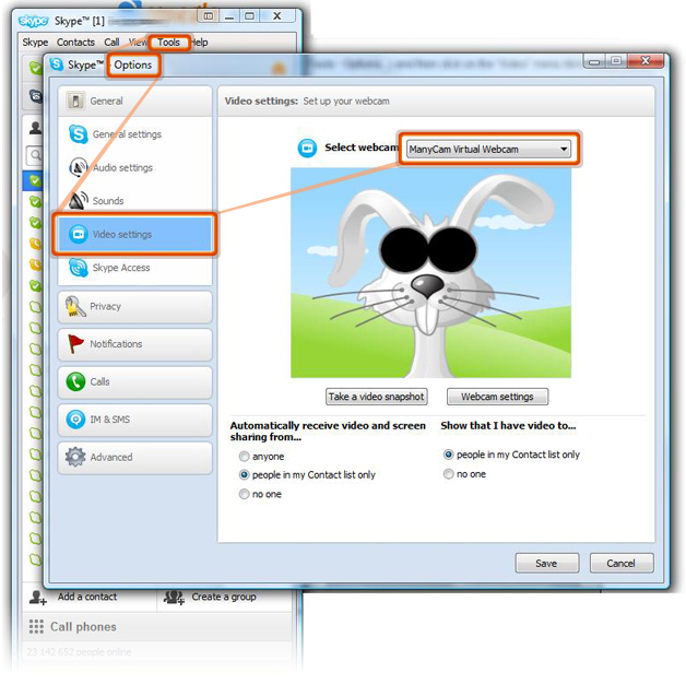 Learn how to use ManyCam with apps and websites like Youtube, Ustream, Facebook Video Chat, Google Hangouts, Ustream and many more. Go to whatever application or website you are using and choose ManyCam as your video and audio source to use it there. When ManyCam is your video source you can use your webcam with multiple applications and websites simultaneously. For example you can use MSN, Skype, and Justin.tv simultaneously with ManyCam.